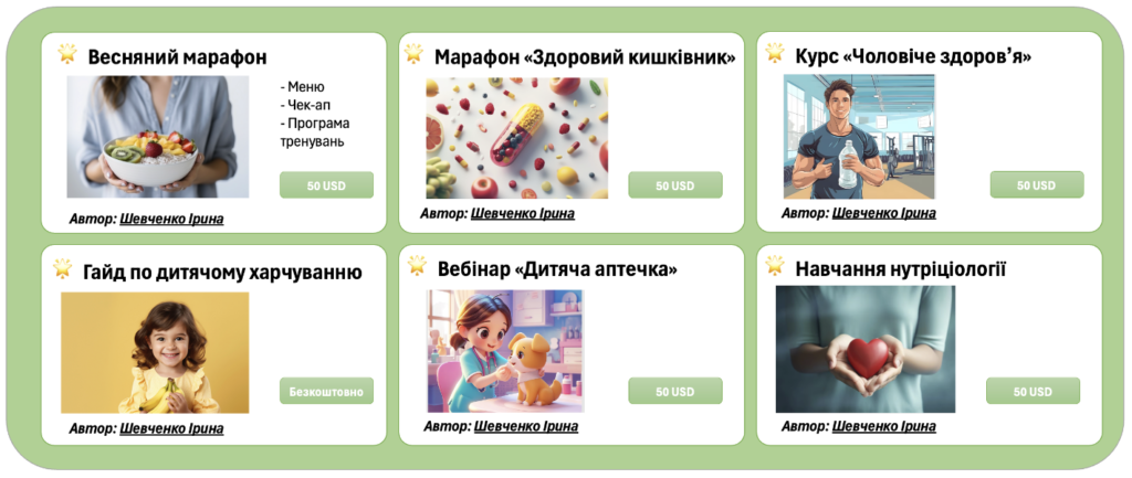Окрім цього, ми співпрацюємо з фахівцями інтегративної медицини та нутріціологами, надаючи їм зручний інструмент для супроводу власних пацієнтів та можливість залучення нових. Отже на платформі ти зможеш ознайомитися із різноманітними програмами оздоровлення – навчальні курси, марафони, методичні матеріали тощо – і обрати найоптимальніший для себе формат, та навіть знайти спеціаліста для індивідуальної роботи.