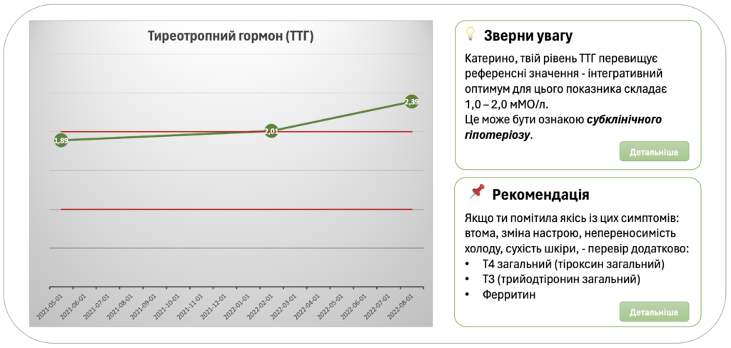 Vitametria стане твоїм надійним помічником у цьому процесі. Наш сервіс допомагає моніторити результати аналізів – оцінювати зміни, виявляти можливі небажані стани та отримувати персоналізовані поради з їх усунення.